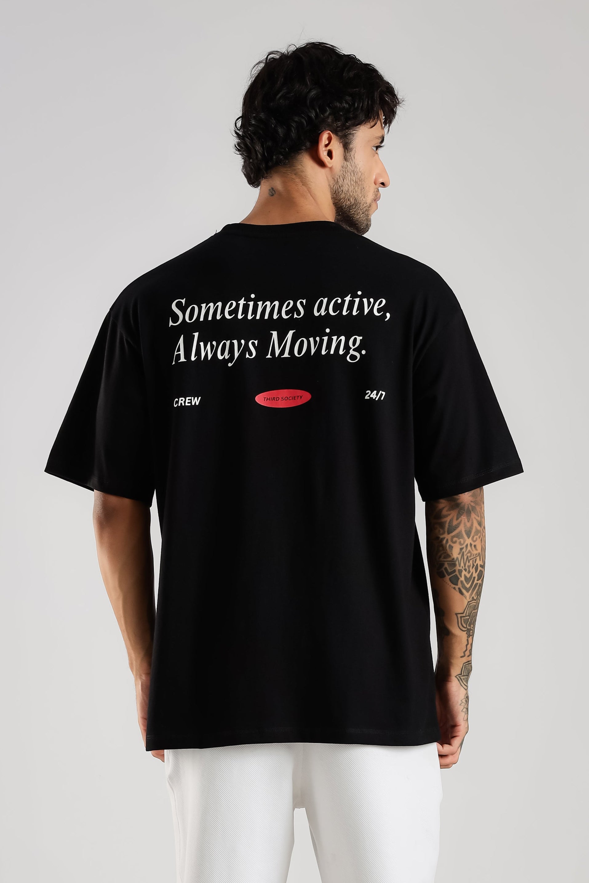 Crafted from premium 220 GSM cotton, the “Some times active, Always Moving” oversized tee from Third Society is built for those who live in motion. Featuring a relaxed drop-shoulder fit, this black tee delivers comfort without compromising on attitude. The back print reads “Sometimes active, Always Moving.” A subtle nod to the relentless energy of the streets. Finished with “Third Society / CREW / 24/7” detailing, it’s more than apparel it’s a uniform for those who move different. Whether you’re cooling down or clocking miles, this piece stays ready.